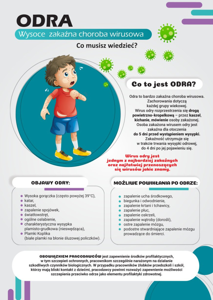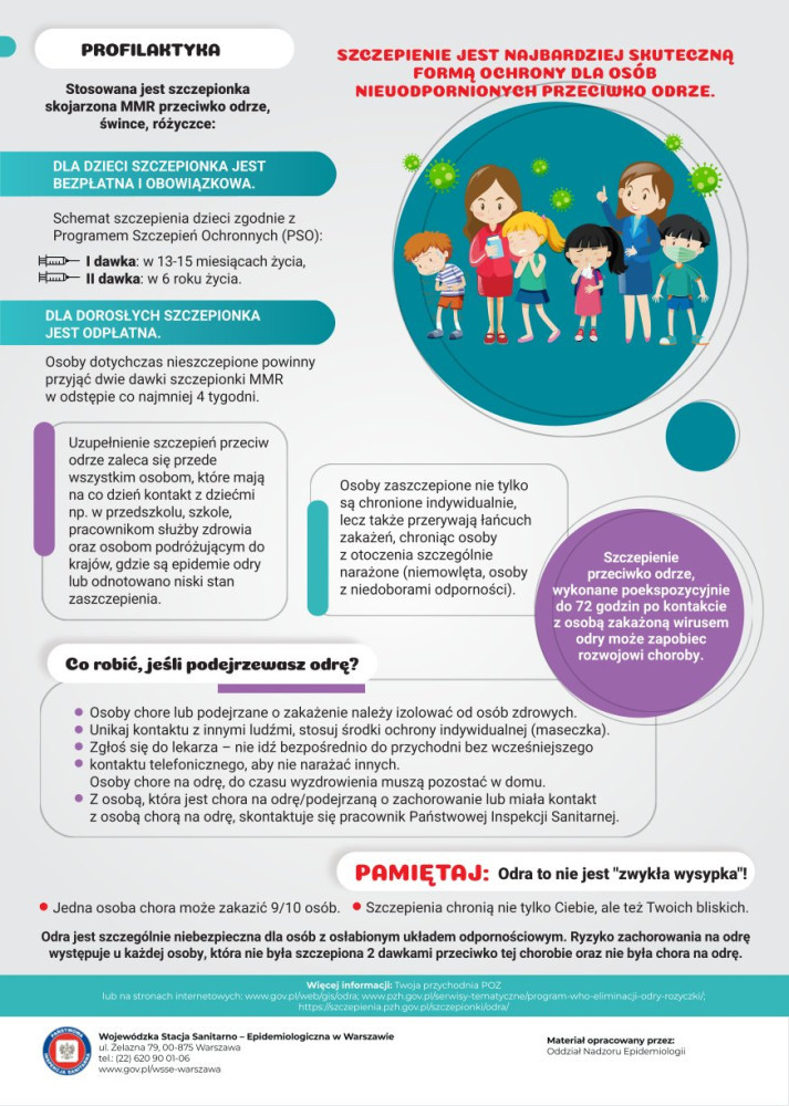 w związku z rozpoczęciem nowego roku szkolnego 2025/2026 oraz niewystarczającym stanem zaszczepienia populacji dzieci i młodzieży przeciwko odrze, w imieniu Państwowego Powiatowego Inspektora Sanitarnego w m.st. Warszawie w załączeniu przekazujemy ulotkę informacyjną na temat wysoce zakaźnej choroby wirusowej jaką jest ODRA.
