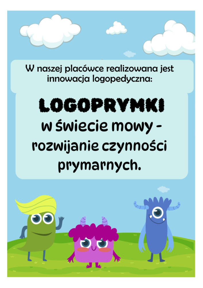 Innowacja „Logoprymki w świecie mowy – rozwijanie funkcji prymarnych” została opracowana w celu poprawy funkcjonowania dzieci w zakresie rozwoju czynności prymarnych i artykulacji, a także dla zwiększenia oddziaływań terapeutycznych, mających na celu skorygowanie lub usprawnienie przebiegu funkcji prymarnych u dzieci, jak też zapobieganiu występowania odstępstw od normy w tym zakresie.